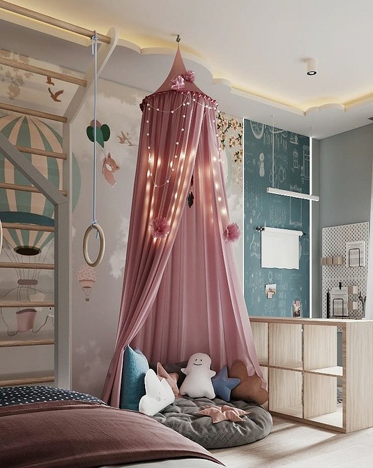 - Для детей разных возрастных категорий пространство важно разделить, чтобы игры младшей девочки не мешали занятиям старшей;